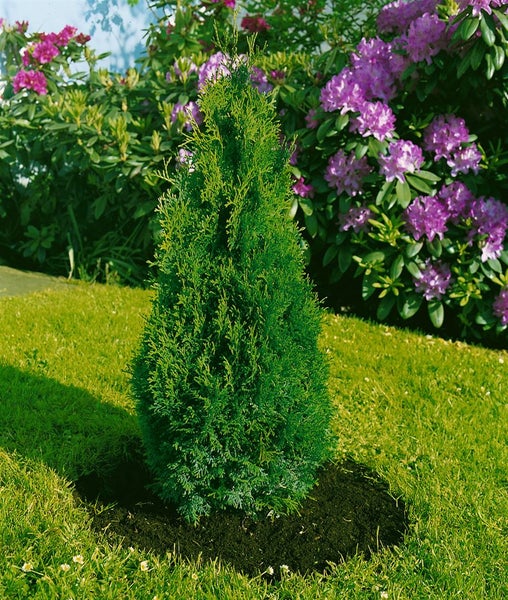 Am besten gedeiht der Lebensbaum an einem sonnigen bis halbschattigen Standort auf frischen, durchlässigen, humosen Böden. Staunässe sollte vermieden werden, gleichmäßige Feuchte fördert den dichten Austrieb. Ein leicht saurer bis neutraler pH-Wert ist ideal, doch zeigt sich ‘Holmstrup’ insgesamt bodentolerant. Ein maßvoller Rückschnitt ist möglich und erhält die kompakte Form, umfangreiches Formieren ist meist nicht nötig. Nach dem Einpflanzen empfiehlt sich eine gute Wasserversorgung, Mulch hält die Wurzelzone länger frisch. Dank seiner Winterhärte, Windfestigkeit und der robusten, aufrechten Wuchsform bleibt dieser Koniferen-Klassiker über Jahre hinweg ein pflegeleichter Strukturgeber. Ob als schmale Hecke, als architektonisches Gestaltungselement im Beet oder als grüner Akzent im Vorgarten – Thuja ‘Holmstrup’ verbindet dezente Eleganz mit dauerhaftem Gartenwert.