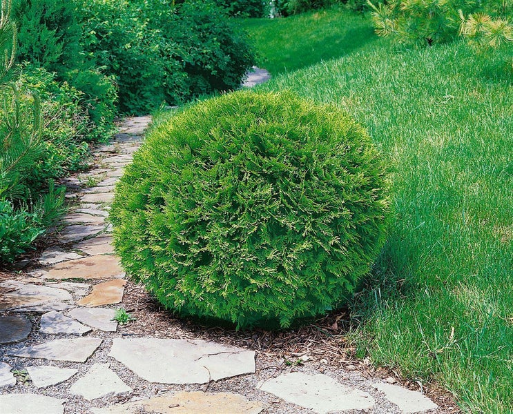 Thuja occidentalis ‘Recurva Nana’, der Abendländische Lebensbaum in der Zwergform, präsentiert sich als kompakte, langsam wachsende Konifere mit elegant gebogenen Trieben und fein geschupptem, dichtem, immergrünem Laub. Die frisch bis sattgrünen Schuppenblätter behalten ihre Farbe ganzjährig und können in kalter Witterung leicht bronzefarben überhaucht sein, was zusätzliche Strukturwirkung im winterlichen Garten erzeugt. Die unauffälligen Blüten im Frühjahr werden von kleinen bräunlichen Zapfen abgelöst, im Fokus stehen jedoch die harmonische, rundlich bis kegelige Wuchsform und die gleichmäßige Belaubung. Als Nadelgehölz für den Ziergarten eignet sich ‘Recurva Nana’ hervorragend als Solitär im Vorgarten, als niedriges Formgehölz im Steingarten, für strukturierte Gruppenpflanzungen im Beet oder als dauerhafte Kübelpflanze auf Terrasse und Balkon, wo sie als immergrüne Akzentpflanze ganzjährig überzeugt. Sie bevorzugt einen sonnigen bis halbschattigen Standort mit humosem, frischem, gut durchlässigem Boden; Staunässe sollte vermieden werden, während gleichmäßige Bodenfeuchte in Trockenphasen geschätzt wird. Eine mulchauflage unterstützt das Wurzelklima, und eine maßvolle Düngung im Frühjahr fördert die dichte Benadelung. Der Gartenstrauch ist sehr schnittverträglich, meist reicht ein leichter Formschnitt nach dem Neuaustrieb, um die kompakte Silhouette zu erhalten; starke Rückschnitte sind möglich, jedoch besser schrittweise. Dank des gemäßigten Wachstums ist dieser Zierstrauch ideal für kleine Gärten und repräsentative Eingangsbereiche, wo er als pflegeleichtes, robustes Nadelgehölz dauerhafte Struktur und Ruhe in Kombination mit Stauden, Gräsern und anderen Blütensträuchern bietet.