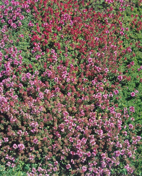 Thymus praecox ‘Purpurteppich’, der Teppich-Thymian oder Polster-Thymian, ist eine niedrig wachsende Polsterstaude mit dichtem, teppichbildendem Wuchs und fein aromatischem, immergrünem Laub. Die Sorte beeindruckt mit intensiv purpurrosa bis violettroten Blüten, die je nach Witterung von Mai bis Juli in großer Fülle erscheinen und über dem frischgrünen Blattwerk leuchten. Der Wuchs bleibt flach und kompakt, ideal als Bodendecker für sonnige Lagen, wobei sich mit der Zeit geschlossene, trittfeste Polster bilden, die Wege und Fugen weich umspielen und strukturstarke Flächen im Beetvordergrund schaffen. Als Zierstaude für Steingarten, Trockenmauer, Kiesbeet und Vorgarten eignet sich ‘Purpurteppich’ ebenso wie für Schalen und Tröge auf Terrasse oder Balkon, wo er als Kübelpflanze und flächige Unterpflanzung einen ruhigen, pflegeleichten Akzent setzt; in Gruppenpflanzung entstehen homogene, dichte Teppiche, während einzelne Polster als kleiner Solitär dekorativ wirken. Bevorzugt werden vollsonnige, warme Standorte mit durchlässigem, eher magerem, sandig-kiesigem und gerne kalkhaltigem Substrat; Staunässe wird schlecht vertragen, weshalb Drainage im Pflanzbereich wichtig ist. Die Pflege ist unkompliziert: Ein leichter Rückschnitt nach der Blüte erhält die dichte, niedrige Struktur und fördert die Vitalität, auf zusätzliche Düngergaben kann weitgehend verzichtet werden. Dieser robuste Gartenstaude gelingt als dauerhaft grüner Bodendecker besonders dort, wo Hitze und Trockenheit andere Zierpflanzen fordern, und verleiht Steingärten, Beeträndern und Wegrändern eine elegante, fein duftende Teppichwirkung.