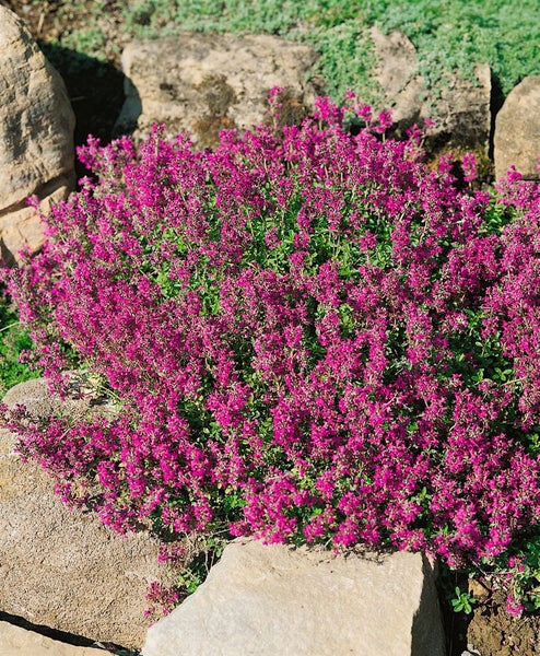 Thymus serpyllum ‘Creeping Red’, der Teppich-Quendel beziehungsweise Sand-Thymian, ist eine aromatische Kräuterstaude mit besonders flach kriechendem Wuchs, die dichte, trittfeste Polster bildet. Von Frühsommer bis Spätsommer leuchten unzählige purpur- bis karminrote Blüten über frischgrünem, fein aromatischem Laub und verwandeln Beetränder, Steingärten und Kiesflächen in farbige Teppiche. Die immer- bis wintergrüne Blattdecke bleibt niedrig und kompakt, breitet sich teppichartig aus und schließt schnell Fugen und Lücken im Beetvordergrund, entlang von Trittsteinen oder auf sonnigen Trockenmauern. Als Bodendecker eignet sich ‘Creeping Red’ hervorragend für flächige Gruppenpflanzungen, als Rasenersatz auf wenig begangenen Teilflächen sowie als Unterpflanzung in Schalen und Kübeln, wo die duftende Gartenstaude elegant über den Rand fällt und mediterranes Flair auf Terrasse und Balkon bringt.