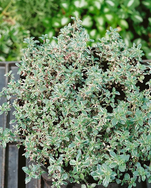 Thymus vulgaris ‘Silver Posie’, der Echte Thymian mit silbrig panaschiertem Laub, vereint Zierwert und Würzkraft in einer außergewöhnlichen Kräuterstaude. Der Gartenthymian zeigt dichtes, fein aromatisches Blattwerk in graugrün mit cremeweißer bis silbriger Randzeichnung, das halbimmergrün durch die Saison strukturiert. Von Mai bis Juli schmückt sich die Polsterstaude mit zarten, hellrosa bis lilafarbenen Blüten, die den kompakten, buschigen Wuchs dezent unterstreichen. ‘Silver Posie’ bleibt niedrig und polsterbildend, eignet sich daher hervorragend als Bodendecker, Einfassung und für die Wegekante, setzt aber auch im Kräuterbeet, Steingarten und Vorgarten stilvolle Akzente.