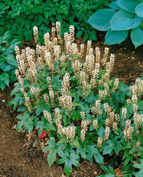 Tiarella laciniata ‘Pink Bouquet’, die Schaumblüte, begeistert als elegante Waldstaude mit filigranen, rosa Blütenkerzen und fein gelapptem, dekorativ gezeichnetem Laub. Im Frühjahr bis in den frühen Sommer öffnen sich unzählige zartrosé bis weiß aufhellende Blüten auf schlanken Stielen, die über dem bronzegrün marmorierten Blattwerk zu schweben scheinen. Das halbimmergrüne, tief eingeschnittene Laub sorgt auch außerhalb der Blüte für Zierwert und bildet dichte, niedrige Polster von kompakt-horstigem bis leicht teppichbildendem Wuchs, ideal für strukturreiche Schattenbereiche. Als Staude für halbschattige bis schattige Plätze ist ‘Pink Bouquet’ vielseitig einsetzbar: Sie veredelt das schattige Beet, den Gehölzrand und den Waldgarten, wirkt als zierende Unterpflanzung von Sträuchern und kleinen Bäumen und überzeugt im Vorgarten ebenso wie im Schattengarten als ruhiger Bodendecker. In größeren Gruppen entsteht ein harmonischer Blütenteppich, während sie im Kübel auf Terrasse oder Balkon schattige Ecken attraktiv belebt; auch als zierlicher Solitär im Staudenbeet setzt sie feine Akzente. Ein humoser, lockerer, gleichmäßig frischer bis leicht feuchter Boden fördert Vitalität und Blühfreude, Staunässe sollte vermieden werden. Ein Platz mit Morgen- oder Abendsonne und Schutz vor heißer Mittagssonne ist ideal. Leichter Rückschnitt der verblühten Stiele und eine dünne Schicht Laubhumus im Frühjahr genügen als Pflege, gelegentliches Gießen in Trockenphasen hält die Pflanze dauerhaft vital. Robust und zuverlässig wächst diese Zierstaude harmonisch mit Farnen, Hosta, Heuchera oder Brunnera zusammen und bringt zarte Leichtigkeit in schattige Gartenräume.
