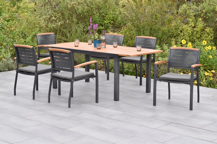 Das Tinos Set ist perfekt für den Außenbereich geeignet und zeichnet sich durch sein stilvolles Aussehen aus. Die gelungene Kombination aus Aluminium und Akazienholz bietet eine ansprechende und moderne Optik.Das 7tlg. Tinos Set ist ideal für einen perfekten Outdoor-Tag geeignet. Die sechs Stapelsessel sind nicht nur ein echter Hingucker für Ihren Garten sondern lassen sich bei Bedarf auch platzsparend stapeln.Der Rückenabschluss und die Armlehnen aus Akazienholz verleihen den Sesseln ein elegantes Design. Erhöht wird der Sitzkomfort durch die Sitzkissen in einem modernen Grauton.Der Tisch mit den Grundmaßen von 150 x 90 cm überzeugt durch seine Tischplatte aus Akazienholz. Bei Bedarf lässt sich der Tisch auf eine Länge von 200 cm ausziehen. Der Tisch bietet genügend Platz zum dinieren mit Freunden und Familie. Entdecken Sie selbst die stilvolle Optik und die hohe Qualität der Tinos Serie. Sie werden von diesem eleganten und funktionalen Outdoor-Set begeistert sein. Genießen Sie entspannte Stunden im Freien und schaffen Sie eine gemütliche Atmosphäre in Ihrem Garten oder auf Ihrer Terrasse.