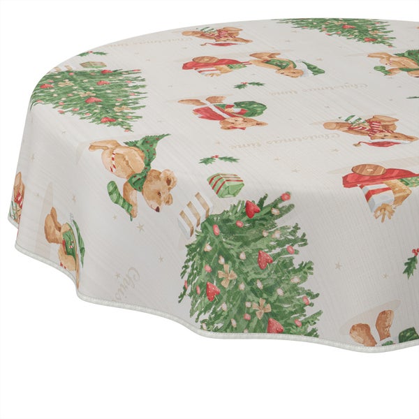 Tischdecke Aquarell Teddybär Weihnachten Beige Rund 140cm mit Band-Kante Wachstuch abwaschbar