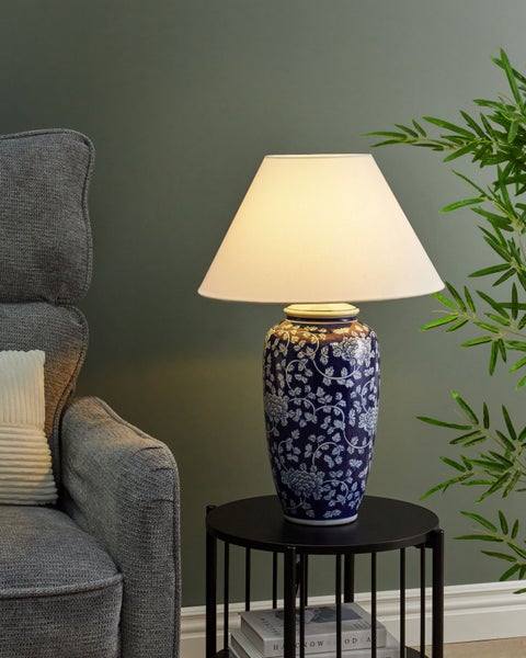 Tischlampe mit Blumenmotiv. Diese elegante Tischleuchte hat einen schönen Porzellanfuß mit einem zarten, handgemalten Blumenmuster, das jedem Raum einen Hauch von Raffinesse verleiht. Der helle Leinenschirm ergänzt den Sockel und sorgt für ein warmes, weiches Licht. Ausgestattet mit einem leicht zu bedienenden Ein-/Ausschalter ist diese Lampe sowohl funktional als auch stilvoll. Details: Typ Tischleuchten. Stil: Klassisch. Farbe: Blau. Material: Keramik. Material: Porzellan. Zusätzliches Material: Leinen. Material Lampenfuss: Porzellan. Material Lampenschirm: Stoff. Zusammenstellung: 100% Leinen. Fassung: Max. 60 W. Finish: Handgemalt. Schutzklasse: IP 20. Anzahl der Glühbirnen: 1. Spannung 230 V (50 Hz). Abmessungen: Fuß: 6x6x36. Kabellänge: 180 cm. Tiefe: 42 cm. Breite: 42 cm. Höhe: 62 cm. Gewicht: 3 kg. .Sie kaufen: 1 x Tischleuchte, Nicht im Lieferumfang enthalten: Leuchtmittel. Produktvorteile: Ausgestattet mit einem Ein/Aus-Schalter, Dekorativ und zugleich funktional, Wunderbar geeignet für Schlaf- und Wohnbereich, Gemütliche Ausstrahlung, Hochwertiges Material. Montage: Teilweise montiert. Pflegeanleitung: Porzellan: 1.Bitte ausschließlich milde Reinigungsmittel und weiche Tücher verwenden. Feuchte Stellen sofort trocken reiben. Leinen: Aufliegender Staub sollte sanft mit einem Staubwedel entfernt werden.