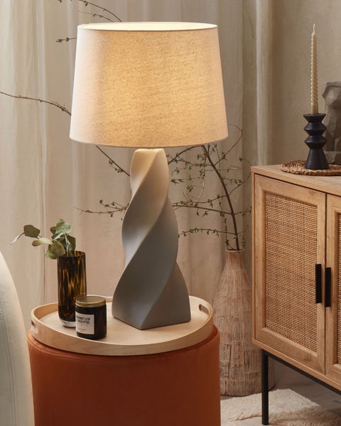 Tischlampe mit geschwungenem Fuß. Diese Leuchte ist keine gewöhnliche Tischleuchte, sondern ein äußerst dekoratives Akzentstück, das jede Inneneinrichtung ergänzt. Der Sockel in Form eines Wirbels ist aus Keramik gefertigt und mit einem cremefarbenen Stoffschirm versehen, der für einen eleganten Look sorgt. Stellen Sie sie auf eine Kommode und bringen Sie eleganten Stil in jedes Schlafzimmer, Wohnzimmer oder jeden Flur. Details: Typ Tischleuchten. Farbe: Grau. Farbton: Hellbeige. Material: Keramik. Material: Keramik. Zusätzliches Material: Baumwolle. Material Lampenfuss: Keramik. Material Lampenschirm: Jute. Zusammenstellung: 65% Jute. Fassung: 40 W. Schutzklasse: IP 20. Anzahl der Glühbirnen: 1. Spannung 230 V (50 Hz). Abmessungen: Fuß: 15x15. Kabellänge: 220 cm. Tiefe: 38 cm. Breite: 38 cm. Höhe: 71 cm. Gewicht: 3 kg. .Sie kaufen: 1 x Tischleuchte, Nicht im Lieferumfang enthalten: Leuchtmittel. Produktvorteile: Langes Kabel für einfachen Zugang zur Stromquelle, Ausgestattet mit einem Ein/Aus-Schalter, Wunderbar geeignet für Schlaf- und Wohnbereich, Dekorativ und zugleich funktional, Handgefertigte Präzision. Montage: Teilweise montiert.5 - 15 Min. Zusatzinformationen: Diese Leuchte ist geeignet für Leuchtmittel der Energieklassen A bis G auf einer Skala von A (sehr effizient) bis G (weniger effizient). Geeignet für: LED Leuchtmittel, Eco-Halogen Leuchtmittel, Energiesparleuchtmittel. Die Stromkabel dürfen nur von einem qualifizierten Elektriker angepasst werden. Bitte beachten Sie, dass jedes Produkt handgefertigt ist. Abweichungen in Struktur, Farbe oder Form können aufgrund der Eigenschaften der verwendeten Materialien auftreten und stellen keinen Qualitätsmangel dar. Pflegeanleitung: Keramik: 1.Bitte ausschließlich milde Reinigungsmittel und weiche Tücher verwenden. Feuchte Stellen sofort trocken reiben. Jute: 1.Flecken können mit einem Polsterreiniger, einem angefeuchteten Schwamm oder milden Reinigungsmitteln entfernt werden. 2.Oberflächen nur mit geeignetem Aufsatz vorsichtig absaugen.