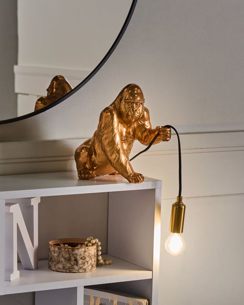 Glamouröse Glühbirnen-Optik Tischleuchte in Gorillaform. Diese originelle, handbemalte Tierleuchte ist genau das, was Sie brauchen, um in Ihrem Wohnraum, Studio oder Arbeitsbereich für Aufsehen zu sorgen. Die Gorilla-Leuchte besteht aus robustem Kunstharz, das sowohl eine langlebige Qualität als auch einen stabilen Stand der Tischlampe garantiert. Dank des extra langen, teilweise herausziehbaren Kabels ist sie einfach zu positionieren. So kann sie auf Nachttischen, Sideboards, Konsolentischen oder etwas höheren Möbeln platziert werden und trotzdem als stilvolle Lichtquelle dienen oder auch einfach als luxuriöses Deko-Element in Ihrer Einrichtung genutzt werden. Details: Typ Tischleuchten. Farbe: Gold. Material: Kunststoff. Material: Kunstharz. Fassung: Max. 6 W. Finish: Handgemalt. Anzahl der Glühbirnen: 1. Spannung 230 V (50 Hz). Abmessungen: Kabellänge: 188 cm. Tiefe: 20 cm. Breite: 15 cm. Höhe: 21 cm. Gewicht: 1 kg. .Sie kaufen: 1 x Tischleuchte, Nicht im Lieferumfang enthalten: Leuchtmittel. Produktvorteile: Ausgestattet mit einem Ein/Aus-Schalter, Wunderbar geeignet für Schlaf- und Wohnbereich, Erzeugt Wohlfühlcharakter in jedem Raum, Handgefertigte Präzision, Qualitativ hochwertiges Material. Montage: Teilweise montiert.5 - 15 Min. Zusatzinformationen: Diese Leuchte ist geeignet für Leuchtmittel der Energieklassen A bis G auf einer Skala von A (sehr effizient) bis G (weniger effizient). Geeignet für: LED Leuchtmittel, Eco-Halogen Leuchtmittel, Energiesparleuchtmittel. Bitte beachten Sie, dass jedes Produkt handgefertigt ist. Deshalb kann der Farbton und die Größe leicht von dem Bild abweichen. Pflegeanleitung: Kunstharz: 1.Bitte ausschließlich milde Reinigungsmittel und weiche Tücher verwenden. Feuchte Stellen sofort trocken reiben.