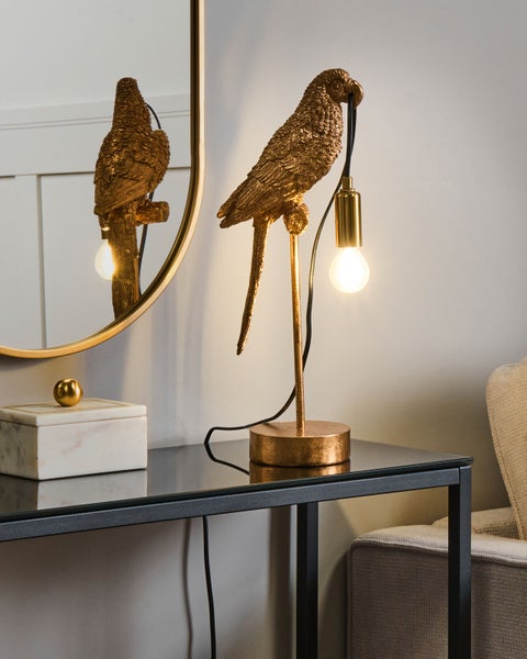 Glamouröse Glühbirnen-Optik Tischleuchte in Papageiform. Verleihen Sie Ihrer Einrichtung mit dieser originellen Papagei-Tischleuchte einen auffälligen Luxus-Touch. Sie eignet sich sowohl als Dekofigur als auch als Tischlampe und passt perfekt auf jede Tischfläche, kann aber auch wegen ihrer Größe als Bodendekoration benutzt werden. Dank des extra langen, teilweise herausziehbaren Kabels können Sie die Tierlampe nicht nur auf etwas höheren, sondern auch auf etwas niedrigeren Möbeln platzieren. Die Papagei-Leuchte ist aus langlebigem, handbemaltem Kunstharz hergestellt und besitzt einen stabilen, runden Standfuß. Details: Typ Tischleuchten. Farbe: Gold. Material: Kunststoff. Material: Kunstharz. Material Lampenfuss: Metall. Fassung: Max. 6 W. Finish: Handgemalt. Anzahl der Glühbirnen: 1. Spannung 230 V (50 Hz). Abmessungen: Fuß: 14x14. Kabellänge: 190 cm. Tiefe: 14 cm. Breite: 17 cm. Höhe: 46 cm. Gewicht: 1 kg. .Sie kaufen: 1 x Tischleuchte, Nicht im Lieferumfang enthalten: Leuchtmittel. Produktvorteile: Ausgestattet mit einem Ein/Aus-Schalter, Wunderbar geeignet für Schlaf- und Wohnbereich, Erzeugt Wohlfühlcharakter in jedem Raum, Handgefertigte Präzision, Qualitativ hochwertiges Material. Montage: Teilweise montiert.5 - 15 Min. Zusatzinformationen: Diese Leuchte ist geeignet für Leuchtmittel der Energieklassen A bis G auf einer Skala von A (sehr effizient) bis G (weniger effizient). Geeignet für: LED Leuchtmittel, Eco-Halogen Leuchtmittel, Energiesparleuchtmittel. Bitte beachten Sie, dass jedes Produkt handgefertigt ist. Deshalb kann der Farbton und die Größe leicht von dem Bild abweichen. Pflegeanleitung: Kunstharz: 1.Bitte ausschließlich milde Reinigungsmittel und weiche Tücher verwenden. Feuchte Stellen sofort trocken reiben.
