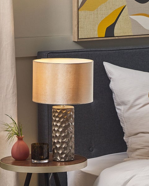 Goldene Nachttischlampe mit trommelförmigem Stoffschirm und langem Kabel. Diese Lampe bringt frischen Wind in Ihre Einrichtung und verleiht ihr einen edlen, glanzvollen Touch. Der Lampenfuß ist aus hochwertiger Keramik gefertigt und punktet mit seinem originellen von Bienenwaben inspirierten Muster. Außerdem verfügt die Leuchte über einen trommelförmigen Samtschirm, der perfekt mit dem schlanken Standfuß harmonisiert. Dank langem, weißem Kabel mit Schalter kann die Raumleuchte fast überall angeschlossen werden. So eignet sie sich hervorragend als Tischdekoration für das Schlafzimmer, das Wohnzimmer oder das Home Office. Details: Typ Tischleuchten. Farbe: Gold. Material: Keramik. Material: Keramik. Zusätzliches Material: Samtstoff. Material Lampenfuss: Keramik. Material Lampenschirm: Jute. Zusammenstellung: 100% Polyester. Fassung: Max. 40 W. Finish: Glänzend. Schutzklasse: IP 20. Anzahl der Glühbirnen: 1. Spannung 230 V (50 Hz). Abmessungen: Fuß: 10x10. Kabellänge: 200 cm. Tiefe: 30 cm. Breite: 30 cm. Höhe: 50 cm. Gewicht: 2 kg. .Sie kaufen: 1 x Tischleuchte, Nicht im Lieferumfang enthalten: Leuchtmittel. Produktvorteile: Ruhespendendes Licht, Langes Kabel für einfachen Zugang zur Stromquelle, Wunderbar geeignet für Schlaf- und Wohnbereich, Ein einzigartiger Hingucker, Elegantes Design, Hohe Qualität, Handgefertigte Präzision. Montage: Teilweise montiert.5 - 15 Min. Zusatzinformationen: Diese Leuchte ist geeignet für Leuchtmittel der Energieklassen A bis G auf einer Skala von A (sehr effizient) bis G (weniger effizient). Geeignet für: LED Leuchtmittel, Eco-Halogen Leuchtmittel, Energiesparleuchtmittel. Die Stromkabel dürfen nur von einem qualifizierten Elektriker angepasst werden. Bitte beachten Sie, dass jedes Produkt handgefertigt ist. Abweichungen in Struktur, Farbe oder Form können aufgrund der Eigenschaften der verwendeten Materialien auftreten und stellen keinen Qualitätsmangel dar. Pflegeanleitung: Keramik: 1.Bitte ausschließlich milde Reinigungsmittel und weiche Tücher verwenden. Feuchte Stellen sofort trocken reiben. Jute: 1.Bitte ausschließlich milde Reinigungsmittel und weiche Tücher verwenden. Feuchte Stellen sofort trocken reiben.