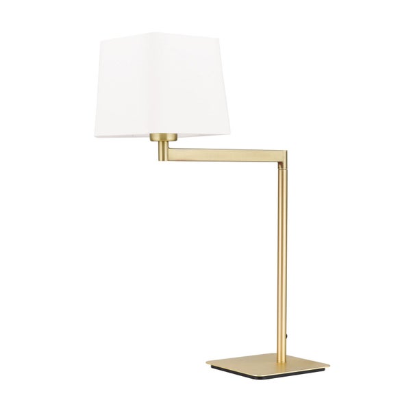 Die Tischleuchte CARLTON Messing Matt schwenkbar überzeugt durch elegantes, funktionales Design. Das satinierte Gestell aus Stahl trägt einen weißen Stoffschirm und fügt sich geschmackvoll ins Wohnambiente ein. Die Leuchte ist durch den schwenkbaren Leuchtenarm flexibel ausrichtbar (Schwenkbereich etwa 160 Grad) und bietet gezielten Lichtkomfort, ideal fürs Lesen oder als dekoratives Licht auf Kommoden oder Schreibtischen. Über einen am Kabel angebrachten Schalter lässt sich die Leuchte bequem bedienen. Sie ist zudem platzsparend konstruiert und eignet sich auch für kleinere Seitentische oder Nachttische