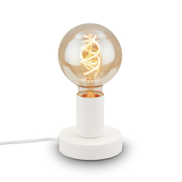 Schlichte 1-flammige Tischleuchte in Weiß Diese weiße 1-flammige Tischleuchte überzeugt mit ihrem schlichten, aber dennoch auffälligen Design. Sie fügt sich optimal in alle Räumlichkeiten ein und wird schnell zu einem stilvollen Blickfang. Vielseitige Einsatzmöglichkeiten Die Tischlampe ist vielseitig einsetzbar, sei es als Nachttischlampe im Schlafzimmer oder als Schreibtischlampe im Arbeitszimmer. Ihr modernes Design macht sie zu einer dekorativen Ergänzung für jeden Raum. Individuelle Lichtgestaltung Bei dieser Tischleuchte können Sie die Lichtfarbe und Helligkeit selbst bestimmen, da das Leuchtmittel im Lieferumfang nicht enthalten ist. So können Sie die Atmosphäre und Ausleuchtung nach Ihren Wünschen gestalten. Bequeme Bedienung über Kabelschalter Der praktische Kabelschalter ermöglicht ein bequemes Ein- und Ausschalten der Leuchte, was die Nutzung im Alltag erleichtert. Kompatibilität mit E27 Leuchtmitteln Die maximale Wattage für diese Nachttischleuchte beträgt 10 Watt (E27-Fassung), was Ihnen die Möglichkeit gibt, die gewünschte Beleuchtung auszuwählen. Hinweise zur Nutzung Mit der Schutzart IP20 ist diese Tischleuchte ausschließlich für den Einsatz im Innenbereich vorgesehen. Produktabmessungen Die Maße der Tischleuchte betragen 100 x 90 mm (Durchmesser x Höhe), was sie kompakt und ideal für kleine Tische oder Nachttische macht.
