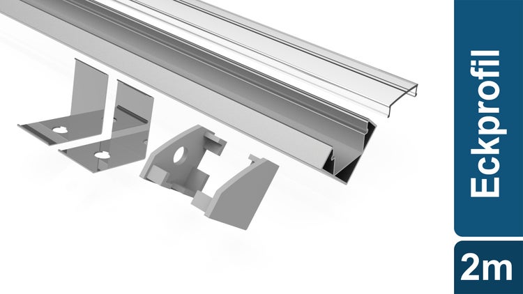 TIVENDIS Led Alu Profil 2 m E45 Komplett Set für Strip / Streifen bis 12 mm breit | Abdeckung transparent klar, Endkappen, Befestigungclips | L-Form Winkel Ecke Winkelprofil Eckprofil eloxiert
