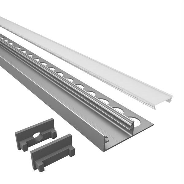 TIVENDIS Led Alu Profil 2 m F2 mit Zubehör für Strip / Streifen bis 14 mm breit | Abdeckung satiniert milchig | Einbau Abschlussleiste Abschlussprofil Fliesenschiene eloxiert