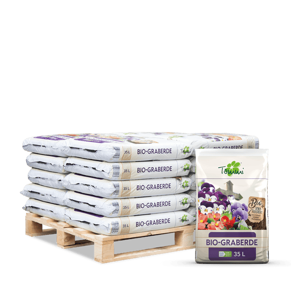 Tommi Bio-Graberde ist die ideale Wahl für eine würdevolle und gepflegte Grabgestaltung. Die hochwertige, dunkle Spezialerde sorgt mit ihrer feinen Struktur für ein ansprechendes Erscheinungsbild und hebt die Bepflanzung optisch hervor – ganz ohne künstliche Farb- oder Rußzusätze. Dank der optimal abgestimmten Nährstoffzusammensetzung unterstützt die Graberde das gesunde Wachstum von Pflanzen und gewährleistet eine langanhaltende Schönheit der Grabstätte. Die torfreduzierte Rezeptur in Kombination mit nachwachsenden Rohstoffen macht Tommi Bio-Graberde zu einer umweltfreundlichen Lösung. Der enthaltene gütegesicherte Rindenhumus verbessert die Bodenstruktur, während Substratkompost eine nachhaltige Nährstoffversorgung sicherstellt. Diese Pflanzerde trägt aktiv zum Erhalt von Hochmooren bei und reduziert CO₂-Emissionen. Ein weiterer Vorteil der Graberde ist ihre unkrauthemmende Wirkung, die den Pflegeaufwand erheblich reduziert. Gleichzeitig bietet die feine Struktur eine optimale Luft- und Wasserversorgung, sodass die Pflanzen bestmöglich gedeihen. Die dunkle Farbe schafft dabei einen edlen Kontrast zur Bepflanzung und unterstreicht die Gestaltung der Ruhestätte. Tommi Bio-Graberde überzeugt zudem durch ihre hervorragende Wiederbefeuchtung und langanhaltende Strukturstabilität. Mit dieser Spezialerde setzen Sie auf bewährte Qualität für eine anspruchsvolle und pflegeleichte Grabbepflanzung. Bestellen Sie die Tommi Bio-Graberde ganz bequem und erhalten Sie die Ware direkt nach Hause geliefert. Die Lieferung erfolgt in praktischen 35-Liter-Säcken, die ordentlich auf einer Palette gestapelt sind und per Spedition zuverlässig ankommen. Je nach Bedarf können Sie zwischen 20 oder 40 Säcken pro Palette wählen.