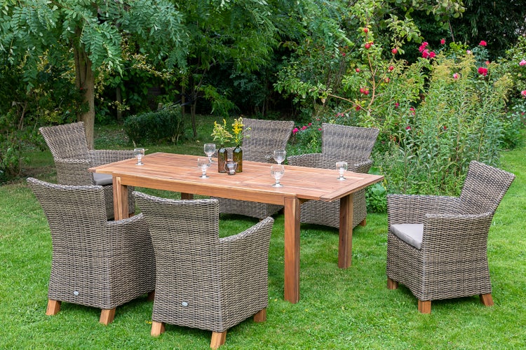 Toskana Gartemöbelset 7tlg., Gartensessel inkl. Auflagen, Ausziehtisch 150 (200) x 90 cm, natur
