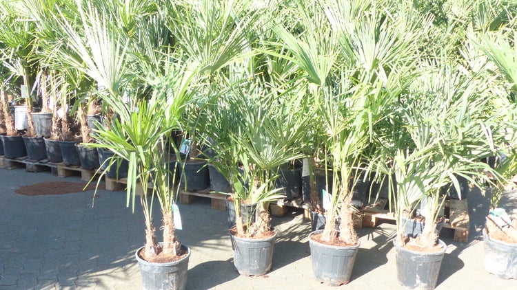 Trachycarpus Fortunei (Chinesische Hanfpalme) wird heute als Zierpflanze in vielen Palmengärten in Europa kultiviert und ist damit eine der am häufigsten ausgepflanzten Gartenpalmen in Europa. Ihre Beliebtheit verdankt die Trachycarpus Fortunei ihrer Widerstandsfähigkeit und Robustheit. Dass Palmen nicht nur tropisches Klima vertragen und bei uns auch außerhalb des Wintergartens prächtig gedeihen können beweist die Chinesische Hanfpalme. Die Trachycarpus aus dem Himalaja fasziniert durch ihre fächerartigen Wedel mit einer Länge von bis zu 60 Zentimetern. Aufgrund ihrer Herkunft hält die Palme Minustemperaturen bis zu -15°C kurzzeitig stand und ältere Pflanzen können ohne weiteres in wintermilden Regionen ganzjährig im heimischen Garten verbringen. Hanfpalmen lieben einen hellen, windgeschützten Standort. In wintermilden Regionen können Trachycarpus bereits in einem Alter von 3 - 4 Jahren in den Garten gepflanzt werden. Je älter die Pflanze ist, desto eher verträgt sie länger anhaltende Frostperioden.