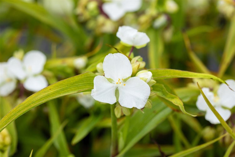 Tradescantia x andersoniana ‘Innocence’, die elegante Dreimasterblume, begeistert als ausdauernde Gartenstaude mit zarten, reinweißen Blüten, die sich über vielen Wochen hinweg öffnen. Von Juni bis September erscheinen die dreiblättrigen Blüten in kontinuierlicher Folge über schmalem, grasartigem Laub in frischem Grün, wodurch ein luftiger, zugleich üppiger Eindruck entsteht. Der horstbildende Wuchs bleibt kompakt und leicht überhängend, erreicht etwa mittlere Staudenhöhe und fügt sich sowohl in klassische Beete als auch in moderne Pflanzungen harmonisch ein. Als Zierstaude für Rabatten, den Bauerngarten oder den Vorgarten eignet sich ‘Innocence’ ebenso wie als dezente Solitärstaude im Staudenbeet, am Gehölzrand oder am Teichrand, wo gleichmäßig frischer Boden geschätzt wird. Auch als Kübelpflanze auf Terrasse und Balkon setzt die Sorte lichte Akzente und punktet mit ihrem langen Blütenflor, besonders in Kombination mit Gräsern, Funkien oder Taglilien in attraktiven Gruppenpflanzungen. Ein sonniger bis halbschattiger Standort fördert die reiche Knospenbildung; der Boden sollte humos, locker und gleichmäßig feucht, jedoch gut drainiert sein. Ein leichter Rückschnitt nach der ersten Hauptblüte regt eine zweite Blütenwelle an, und das Ausputzen verwelkter Blüten erhält die ordentliche Wirkung. Teilung älterer Horste im Frühjahr sorgt für Vitalität und fördert einen dichten Aufbau. Mit ihrer klaren Farbwirkung und der natürlichen, bogigen Wuchsform ist Tradescantia x andersoniana ‘Innocence’ eine vielseitige, pflegeleichte Beetstaude, die Beete, Randbepflanzungen und Gefäße zuverlässig veredelt.