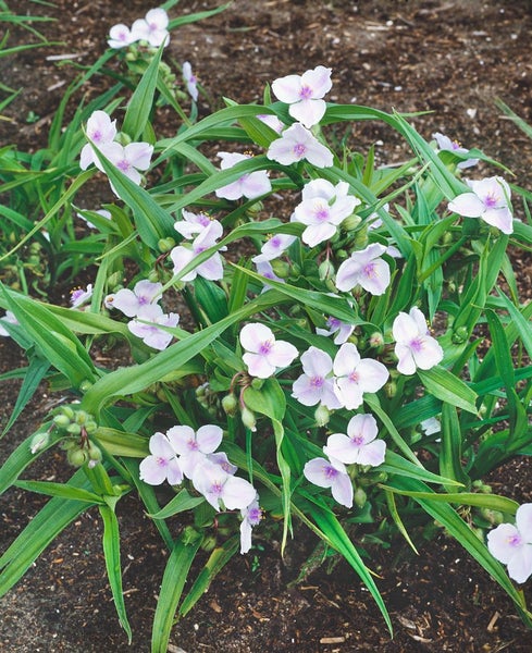 Tradescantia x andersoniana ‘Osprey’, die elegante Dreimasterblume, begeistert als robuste Zierstaude mit schneeweißen, samtig wirkenden Blüten, die durch markant blauviolette Staubfäden einen faszinierenden Kontrast erhalten. Von Juni bis in den Spätsommer erscheinen die Blüten in kontinuierlichen Schüben über schmalem, frischgrünem, grasartigem Laub. Der horstig-buschige Wuchs bleibt kompakt und harmonisch, meist 40–60 cm hoch, wodurch die Blütenstaude sowohl im Vordergrund von Beeten und Rabatten als auch am Gehölzrand eine ausgezeichnete Figur macht. Als Gartenstaude setzt sie helle Akzente in Gruppenpflanzungen, begleitet Wege und Teichränder oder tritt als dezenter Solitär im Vorgarten auf; auch im größeren Kübel auf Terrasse und Balkon überzeugt sie als langlebige Kübelpflanze.