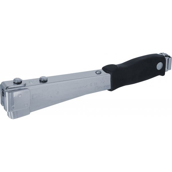 robustes, verchromtes Stahlgehäuse, ergonomischer, rutschfester Handgriff, optimiertes Schlaggewicht von 870g, klassisches Design - seit über 30 Jahren am Markt bewährtes Produkt, einfaches Nachladen dank praktischem Hinterladesystem für zügiges und schnelles Arbeiten, kompatibel mit Regur Klammern des Typs 11 in den Längen 6 mm, 8 mm und 10 mm