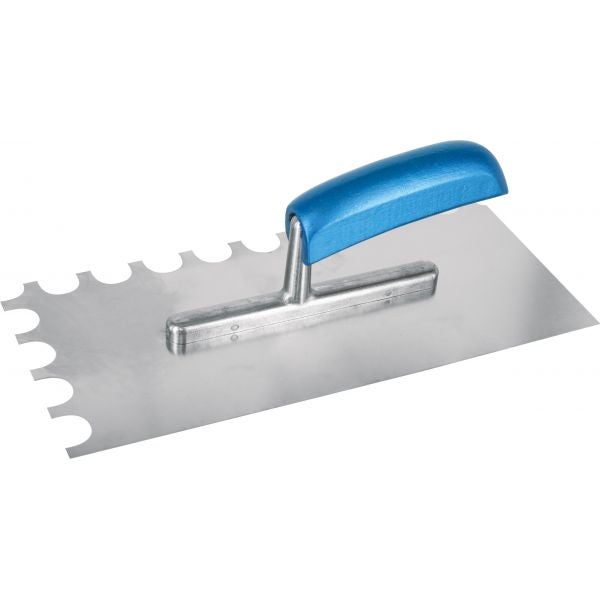 für Mittelbettmörtel, Bandstahl, Blattstärke 0,7 mm, Zahnung: 20 mm breit und 10 mm tief, mit blauem Holzgriff, 20 x 10 mm, 130 x 280 mm