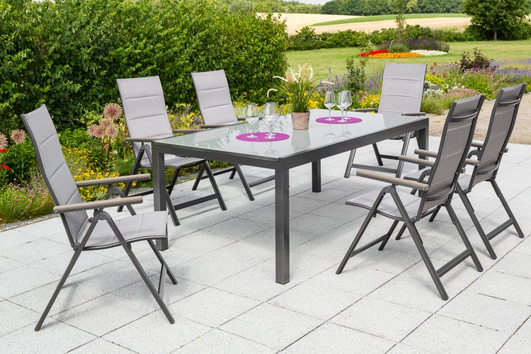 Das 7-teilige Gartenmöbelset Trivero beeindruckt mit seinem modernen Erscheinungsbild. Die 6 Klappsessel sind in einem luxuriösen Diamantbraun gehalten und bieten eine 5-fache Verstellbarkeit der Rückenlehne. Das gepolsterte Textilgewebe auf der Sitz- und Rückenfläche sorgt für ein bequemes Sitzerlebnis. Die elegante Optik der Armlehnen aus Polywood verleiht dem Sessel das gewisse Etwas.Der Ausziehtisch mit einem Grundmaß von 200 x 110 cm lässt sich bei Bedarf auf eine Länge von 300 cm ausziehen.Mit dem graphitfarbenen Gestell und der grauen Glasplatte passt der Gartentisch hervorragend zu den Sesseln.