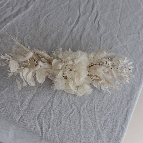 Trockenblumengestecke für deine Hochzeit - Eine tolle Kombination aus Hortensie, Schleierkraut und Lagurus in hellen Weißtönen. Eine Hochzeit aus Trockenblumen ist langlebig und pflegeleicht und sieht einfach atemberaubend aus.