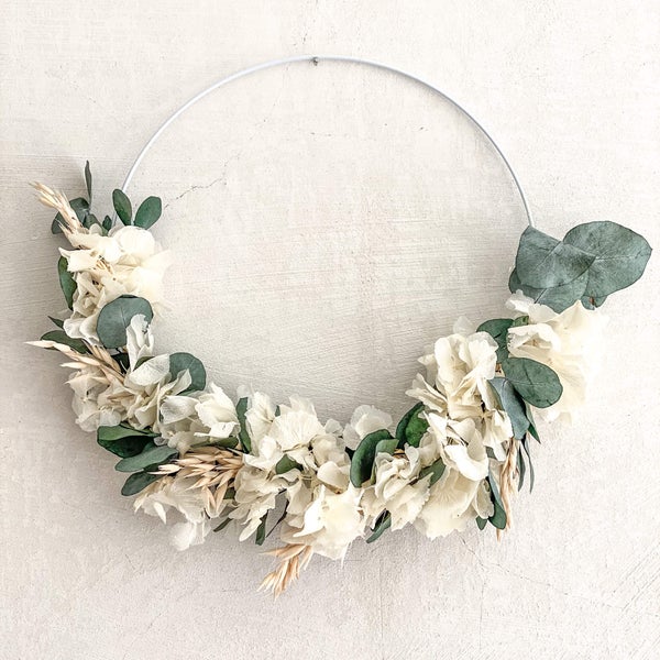 Der Trockenblumenkranz mit stabilisierten Hortensien und Eukalyptus ist ein absoluter Hingucker und verleiht deinem zu Hause ein echten WOW Effekt