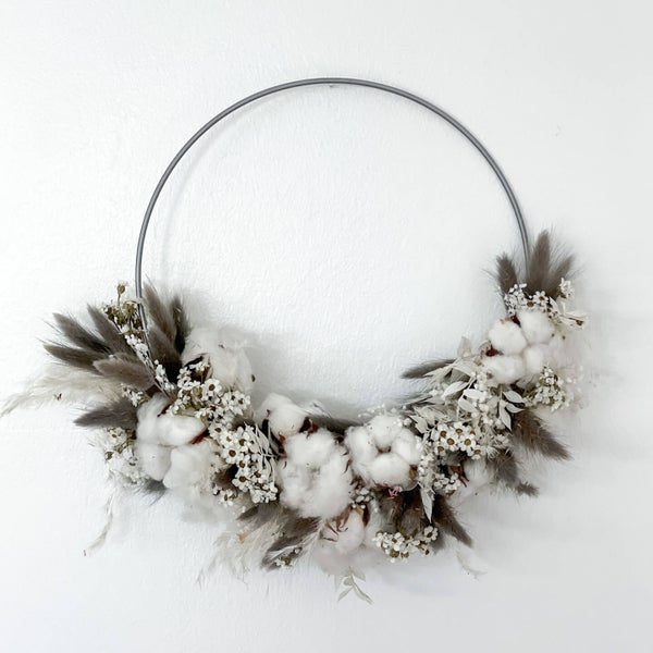 Der winterliche Trockenblumenkranz mit natürlicher Baumwolle, weißen Gänseblümchen und Lagurus versprüht ein winterliches Feeling á la Scandi Living. Unser Kranz ist eine schlichte winterliche Deko Inspiration aus Trockenblumen. Wir sind oft auf der suche nach modernen Kränzen die unsere Haustür oder die vier Wände schmücken. Die Baumwolle ist die Trockenblume schlecht hin und ist besonders im Winter ein tolles Dekoelement für Gemütlichkeit.