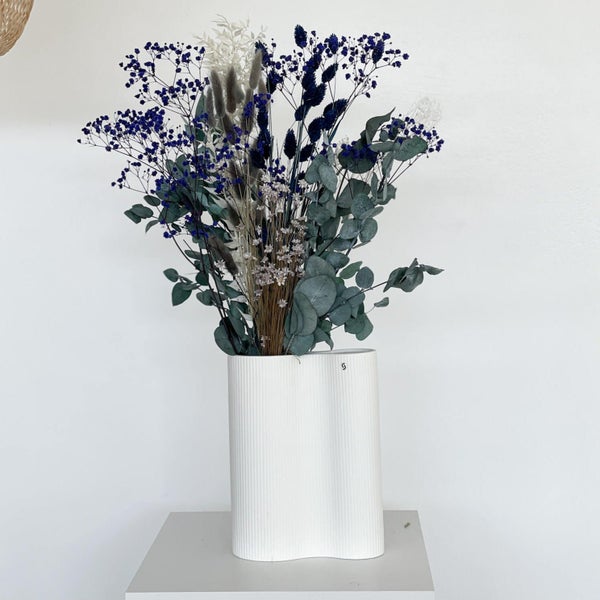 Der Trockenblumenstrauß Eukalyptus blau ist eine lockere Zusammenstellung aus Eukalyptus, Schleierkraut, Phalaris und Glixia. Die Trockenblumen sind eure Lieblinge bei uns im Shop. Der Ruskus und weiß und Lagurus in grau geben dem Strauß die Leichtigkeit.