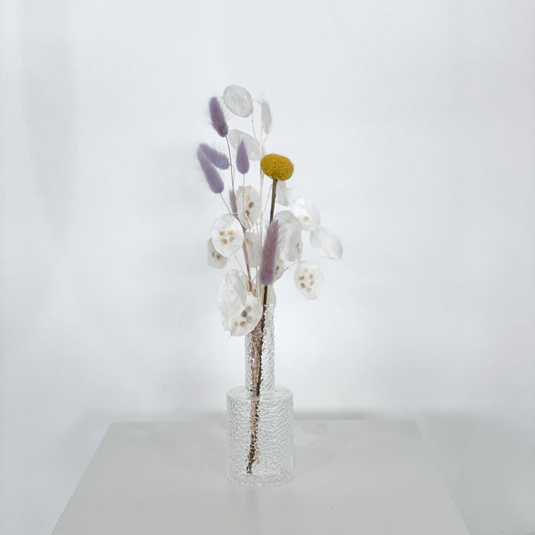 Der Trockenblumenstrauß besticht durch seine weißen Töne und passt perfekt als Tischdekoration im Winter um einen modernen Scandi Look a la verry perri zu erzeugen. Das Lunaria (Silberblatt) in seinen sanften und ruhigen weiß Tönen ist ein allseits Beliebter Strauß in unserem Shop. Die Trockenblumen in gedeckten lila Tönen komplementieren mit den Craspedia in natürlichen gelb die Komposition. Der Strauß eignet sich perfekt als Tischdekoration für Feste oder zum Beispiel Hochzeits- Dekoration.