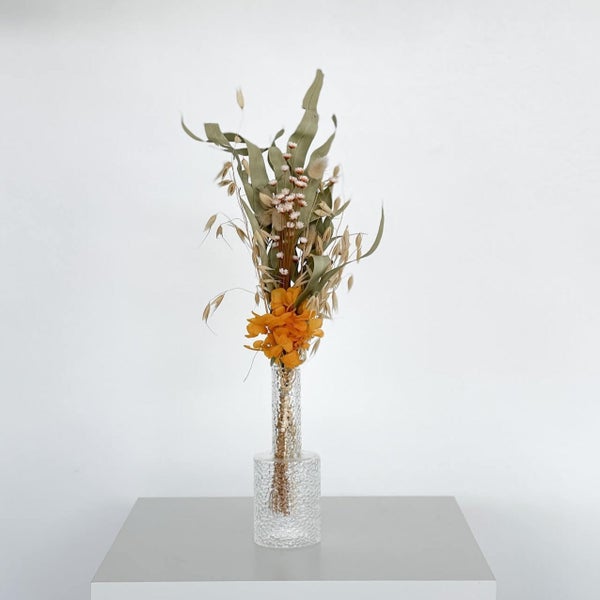 Der Trockenblumenstrauß in klein ist die perfekte Tischdekoration für eine frühlingshafte Hochzeit und lässt deine Gäste strahlen. Der Strauß aus getrockneten Blumen bringt mit den terracotta farbenen Hortensien einfach gute Laune. Die schlichten Glixia verbinden die kräftigen Töne mit dem leichten grün des getrockneten Eukalyptus. Hafer und Schleierkraut in natur geben die Fülle und runden den Strauß ab.
