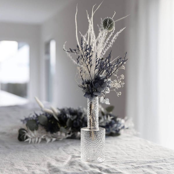 Der kleine Trockenblumenstrauß in Blau ist eine wunderschöne Tischdekoration z.B. für Hochzeiten. Die Kombination aus Hortensie und Eukalyptus sorgt für einen natürlichen Charme und setzt einen eleganten Akzent auf jedem Tisch. Durch die Verwendung von Trockenblumen bleibt der Strauß lange erhalten und kann als Erinnerung an den besonderen Tag aufbewahrt werden.