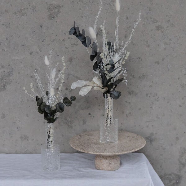 Du suchst nach der perfekten Tischdekoration für Deine Hochzeit? Wie wäre es mit einem kleinen Trockenblumenstrauß in weißen, hellen Tönen? Die Kombination aus Eukalyptus, Pampasgras und Lavendel sorgt für einen natürlichen und zeitlosen Look, der Deine Hochzeit unvergesslich macht.