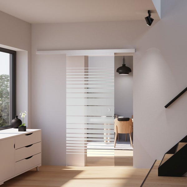 Die Glasschiebetür besteht aus 8mm starkem Einscheibensicherheitsglas (ESG) mit aufgebrachter Sandstrahlung im Dekor Streifen satiniert. Laufschiene ist aus stabilem Aluminium gefertigt und somit rostfrei.
