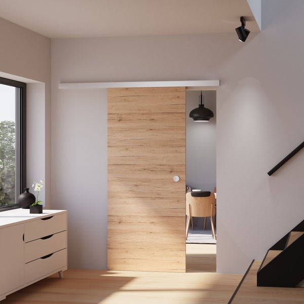Eine Schiebetür trennt Räume voneinander, sorgt für Privatsphäre, ist platzsparend und bietet geöffnet Freiräume. Schick und formschön ist sie eine Bereicherung für den persönlichen Wohnbereich. Lästiges Türknallen gehört der Vergangenheit an, denn diese Schiebetür läuft leise über Leichtlauf-Rollen. Die Tür ist leicht einzubauen und präsentiert sich langlebig und stabil. Die Alu-Laufschiene und eine Bodenführung sorgen für Stabilität und verhindern unliebsames Pendeln.
