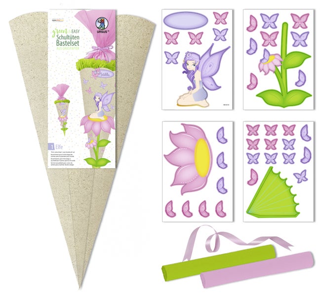 Set enthält Materialien zum Basteln einer Schultüte (Motiv Elfe, Höhe: 68 cm, Durchmesser: 20 cm) aus Graspapier (360 g/m²), 6-eckig (alle Teile vorgestanzt). - Made in Germany