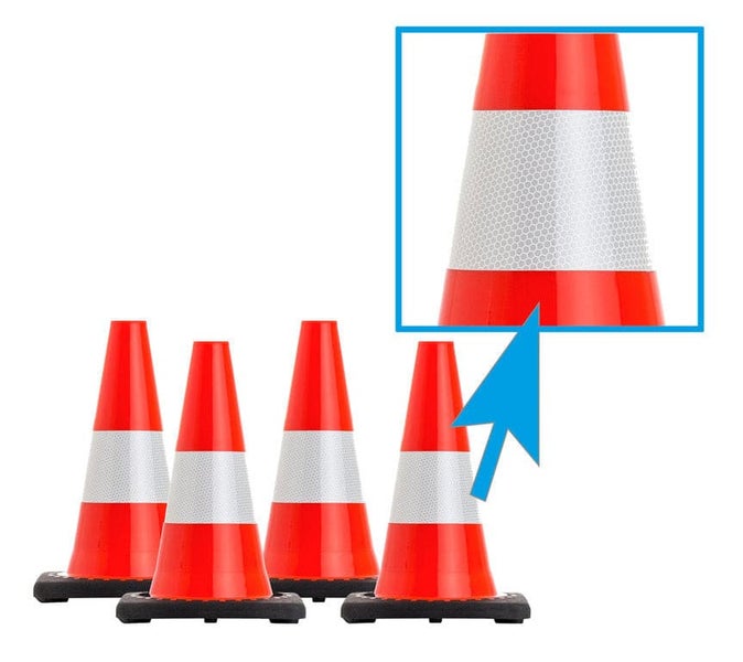 Alle Leitkegel sind mit einem retroreflektierendem Folienstreifen beklebt.