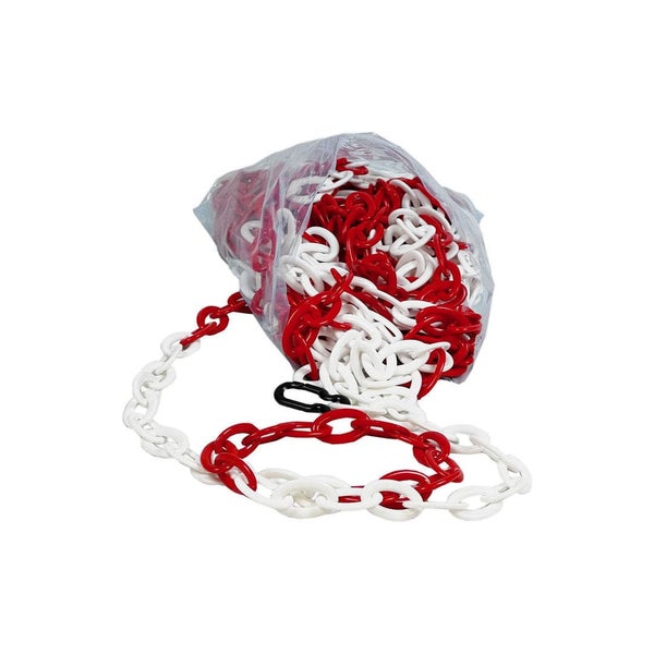 Die Kunststoffkette hat eine Länge von 25 Metern bei einer Stärke von 8 mm. Als Farbe ist abwechselnd ein Stück rot und weiß.