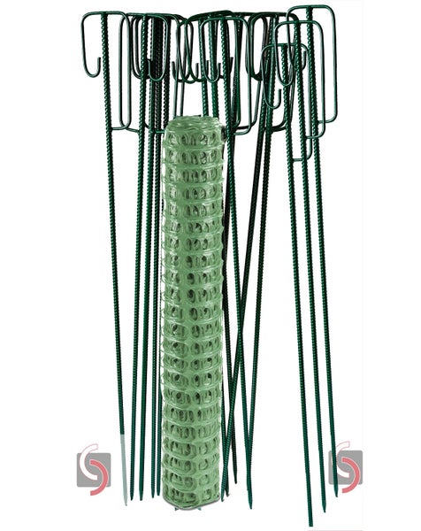 Fangzaun grün - 50 Meter Rolle mit 4,00 kg (80 gr. qm) mit 10 oder 15 grünen Absperrhaltern - Setpreis. (Warnzaun, Absperrzaun, Fangzaun 50 Meter Rolle grüner einfacher Zaun 4,00 kg mit 10 oder 15 Absperrleinenhaltern (Laterneneisen) grün.)
