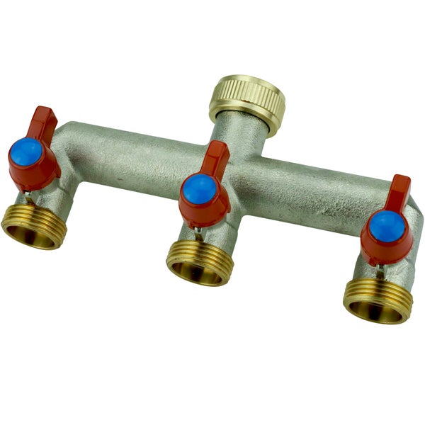 Der 3-Wege-Verteiler besitzt ein 3/4 Zoll (ca. 24,5mm) großes Innengewinde mit Dichtungsring für den Wasserhahn und drei Außengewinde (3/4 Zoll) mit Absperrkugelhähnen zum Anschluss von drei Zulaufschläuchen.