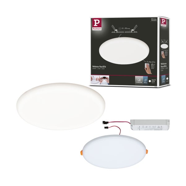Das rahmenlose Veluna Panel mit einer Leistung von 22 Watt sorgt für flächiges neutralweißes Licht. Dank flexibler VariFit-Technik lassen sich die Klemmfedern für den Einbau stufenlos zwischen 45 und 190 mm einstellen. Damit kann das Panel sowohl in bereits vorhandene Bohrlöcher als auch in neue mit Standard Bohrkrone eingebaut werden. Mit der integrierten 3-step-dim Funktion, kann es durch mehrmaliges Betätigen eines handelsüblichen Lichtschalters in drei Stufen gedimmt werden. Die Memory-Funktion merkt sich die zuletzt verwendete Stufe bis zum nächsten Einschalten. Die mögliche Einbautiefe ist abhängig von der gewählten Einbauöffnung: bei 68mm Einbauöffnung muss die Einbautiefe 55mm betragen, bei 90mm Einbauöffnung sind 30mm Einbautiefe nötig.Bei einem Bohrlochdurchmesser von 90 mm wird eine Hohlraumtiefe von 30 mm benötigt und bei einem Durchmesser von 68 mm eine Tiefe von 55 mm.