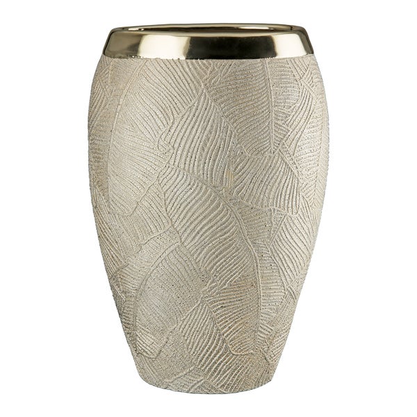 Stilsichere Vasen sind vielseitige und verlässliche Talente wenn es um eine vollendete Dekoration geht. Die Vase Cascade aus Keramik in champagnerfarben wirkt sehr modern und trotzdem zeitlos. Durch ihre Blattstruktur auf der Oberfläche mit abgesetztem champagnerfarbenen Rand wird sie schnell zum außergewöhnlichen Blickfang. Ob als Vase oder dekorativer Solist, auf dem Sideboard oder für eine ausgefallene florale Dekoration im Wohn- oder Esszimmer: Sie macht einfach immer und überall eine gute Figur. Für alle, die das Besondere lieben. Sie suchen noch nach einem außergewöhnlichen Geschenk? Oder wollen sich selbst eine Freude machen! Dann ist diese elegante Vase mit Blattrelief genau die Richtige!