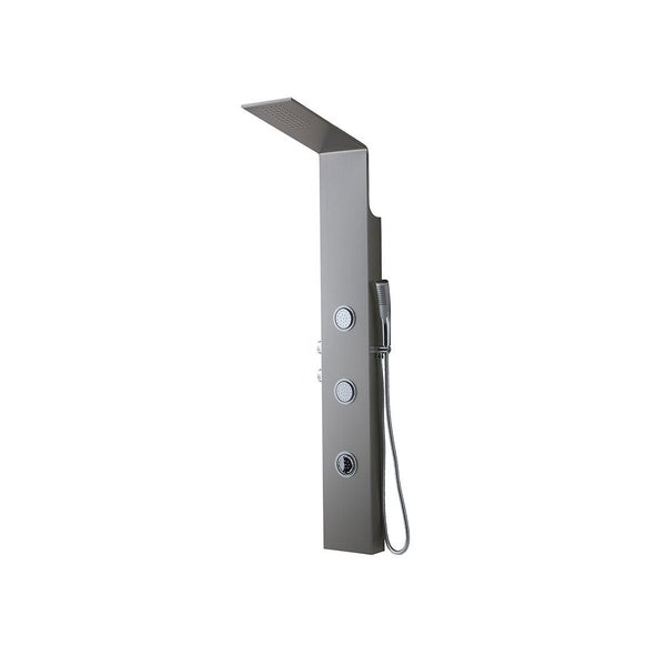 Entdecken Sie das Vergnügen einer erfrischenden Dusche mit diesem eleganten Duschpaneel in Chromoptik. Es ist aus robustem 304er Edelstahl in gebürsteter Ausführung gefertigt und verbindet Ästhetik und Langlebigkeit. Das Paneel ist mit einem integrierten Regenduschkopf, zwei runden Hydromassagedüsen, einer praktischen Handbrause mit flexiblem Schlauch und seitlichen Bedienelementen zur Einstellung der Temperatur und des Strahlart ausgestattet. Die Hauptvorteile sind die zeitgenössischen Linien und ein raffiniertes Aussehen, eine angenehme Massage für tägliche Entspannung und Qualität in einem Produkt. Einfach an der Wand zu befestigen, ist dieses Paneel ideal für eine Renovierung des Duschbereichs ohne invasive Eingriffe. Das schlanke und moderne Design passt leicht zu jedem Badezimmerambiente und wertet es mit einem Hauch von Stil auf. Perfekt für diejenigen, die Funktionalität und Wohlbefinden in einem kompakten Raum suchen.