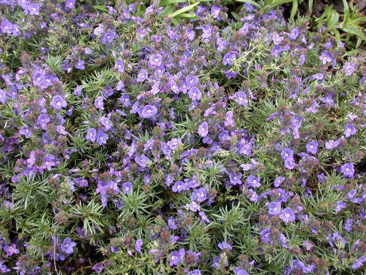 Veronica prostrata, der Niederliegende Ehrenpreis, ist eine kompakt wachsende Staude, die mit dichten, teppichbildenden Polstern überzeugt und im Garten als vielseitiger Bodendecker glänzt. Die flach kriechende Wuchsform bleibt niedrig und ordnet sich elegant ein, während das frisch- bis graugrüne, leicht behaarte Laub das ganze Jahr über eine ordentliche Struktur bietet. Ab späten Frühling bis in den Frühsommer schmückt sich diese Pflanze mit zahlreichen azur- bis himmelblauen Blüten in kurzen, aufrechten Ähren, die den Vordergrund von Beeten, Steingärten und Rabatten wirkungsvoll aufhellen und klare Akzente setzen. Als pflegeleichte Staude eignet sich der Teppich-Ehrenpreis besonders für den Steingarten, Trockenmauern, Wegränder, den sonnigen Vorgarten sowie zur flächigen Gruppenpflanzung im Beetvordergrund; auch in Trögen und kleineren Gefäßen auf Terrasse oder Balkon macht er als niedrige Kübelpflanze eine gute Figur. Er bevorzugt einen sonnigen bis leicht halbschattigen Standort mit durchlässigem, eher sandig-humosem Boden; Staunässe wird nicht gut vertragen, während kurze Trockenphasen problemlos gemeistert werden. Ein leichter Rückschnitt nach der Hauptblüte fördert einen kompakten Wuchs und oft eine zweite, dezente Nachblüte. In Kombination mit anderen trockenheitsverträglichen Stauden und Polsterpflanzen, etwa Thymus, Sedum oder niedrigen Gräsern, entstehen langlebige, pflegearme Pflanzungen, die das Jahr über harmonisch wirken. Veronica prostrata ist eine robuste, winterharte Gartenstaude, die als flächiger Bodendecker ebenso überzeugt wie als sanfter Übergang zwischen Platten, Steinen und Beetflächen.