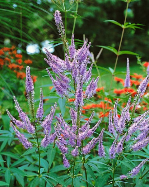 Veronica virginica ‘Fascination’, auch als Virginischer Ehrenpreis bzw. Veronicastrum virginicum ‘Fascination’ bekannt, ist eine eindrucksvolle, aufrecht wachsende Blütenstaude mit elegant kerzenförmigen Blütenähren, die dem Staudenbeet eine markante, vertikale Struktur geben. Von Juli bis September erscheinen lange, fein aufgefächerte Ähren in zart violettrosa bis lavendel, häufig auf dunkel getönten Stielen, die einen harmonischen Kontrast zum tiefgrünen, lanzettlichen Laub bilden. Die Blätter sitzen in charakteristischen Quirlen um die Stängel und unterstreichen den architektonischen, straffhorstigen Wuchs, der je nach Standort stattliche Höhen erreicht und dennoch transparent wirkt.