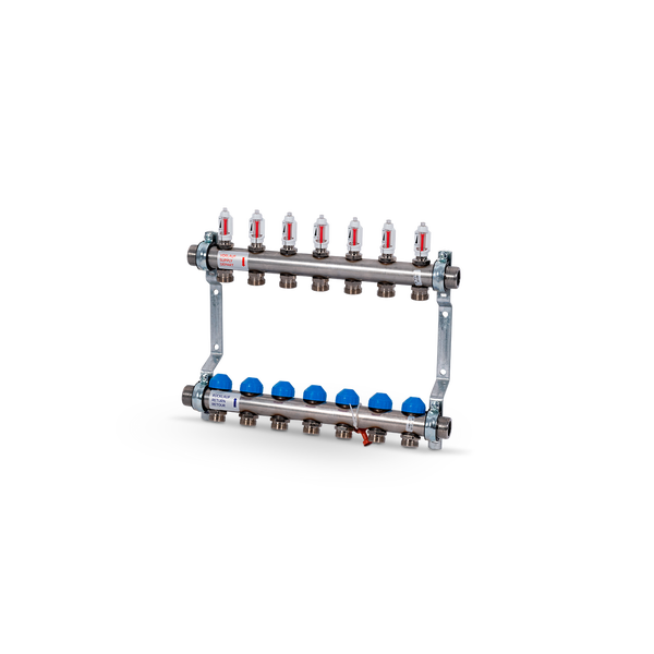 Vorlaufverteiler und Rücklaufsammler aus starkwandigem Edelstahlrundrohr mit beidseitigem Anschlussgewinde 1 AG für rechten oder linken Anschluss, montiert auf Konsolen mit schallgedämmter Befestigung. Heizkreisanschluß 3/4 AG für Eurokonus, Mittenabstand 50 mm. Verteilerendstücke integriert