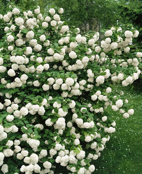 Viburnum opulus ‘Roseum’, der gefüllte Bauernschneeball, ist ein klassischer Blütenstrauch, der mit opulenter Blütenpracht jeden Garten veredelt. Bereits im späten Frühjahr erscheinen zahllose, zunächst zart grünliche, später cremeweiße bis schneeweiße, kugelige Blütenbälle, die von Mai bis Juni eindrucksvoll über dem frischen, gelappten Laub schweben und zum Ende der Blüte mit einem leichten roséfarbenen Hauch ausklingen. Das sommergrüne Laub des Zierstrauchs zeigt im Herbst eine leuchtende bis purpurrote Färbung und setzt so einen weiteren saisonalen Akzent. Der Wuchs ist aufrecht, dicht und buschig, im Alter breit ausladend, was den Schneeballstrauch sowohl als Solitär im Rasen, im Vorgarten oder im Stauden- und Gehölzbeet als auch in der Gruppenpflanzung und als locker aufgebaute Blütenhecke prädestiniert. In großen Gefäßen lässt sich dieser Gartenstrauch für einige Jahre auch als prägnante Kübelpflanze auf Terrasse oder Sitzplatz kultivieren. Bevorzugt werden sonnige bis halbschattige Standorte mit humosem, nährstoffreichem und gleichmäßig frischem, gut durchlässigem Boden; leichte Kalkverträglichkeit ist gegeben, Staunässe sollte vermieden werden. Eine Mulchschicht hält die Feuchtigkeit, in Hitzeperioden hilft zusätzliches Wässern. Der robuste Gehölzklassiker ist winterhart und schnittverträglich; ein maßvoller Rückschnitt unmittelbar nach der Blüte erhält die harmonische Form und fördert die Blühfreude, indem ältere Triebe ausgelichtet werden. Mit seiner nostalgischen Ausstrahlung passt Viburnum opulus ‘Roseum’ ideal in Bauerngärten, Natur- und Landschaftsgärten sowie repräsentative Anlagen und setzt als Blütenstrauch über Jahre eindrucksvolle, pflegeleichte Akzente.