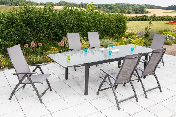 Das 7-teilige Gartenmöbelset Vicenza besticht durch sein modernes Design. Die 6 Klappsessel sind in einem eleganten Diamantbraun gehalten und bieten eine 5-fache Verstellbarkeit der Rückenlehne. Das Gestell der Gartensessel überzeugt durch einen modernen Anthrazitton.Der Ausziehtisch mit einem Grundmaß von 200 x 110 cm lässt sich bei Bedarf auf eine Länge von 300 cm ausziehen und überzeugt durch seine klare Optik.Mit dem anthrazitfarbenen Gestell harmoniert der Gartentisch hervorragend mit den Sesseln.