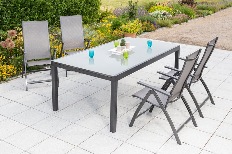 Das 5-teilige Gartenmöbelset Vicenza besticht durch sein modernes Design. Die 4 Klappsessel sind in einem eleganten Diamantbraun gehalten und bieten eine 5-fache Verstellbarkeit der Rückenlehne. Das Gestell der Gartensessel überzeugt durch einen modernen Anthrazitton.Der Ausziehtisch mit einem Grundmaß von 200 x 110 cm lässt sich bei Bedarf auf eine Länge von 300 cm ausziehen und überzeugt durch seine klare Optik.Mit dem anthrazitfarbenen Gestell harmoniert der Gartentisch hervorragend mit den Sesseln.