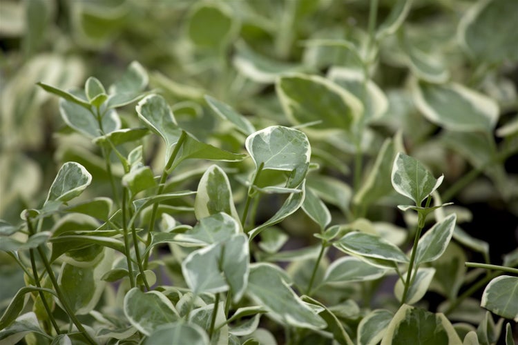 Vinca minor ‘Ralph Shugert’, das Kleine Immergrün, ist eine elegante Bodendecker-Staude mit botanischem Charme und zugleich zuverlässiger Strukturpflanze im Ziergarten. Charakteristisch sind die zarten, violettblauen bis blauvioletten Blüten, die im Frühjahr reich erscheinen und oft eine Nachblüte im Sommer zeigen. Das immergrüne, glänzende Laub mit auffälligem, cremeweißem Blattrand verleiht der Sorte einen besonderen Zierwert über das ganze Jahr. Der Wuchs ist teppichbildend, kriechend und dicht verzweigt, mit einer Wuchshöhe von etwa 10 bis 15 cm, wodurch sich rasch eine geschlossene, pflegeleichte Fläche ergibt.